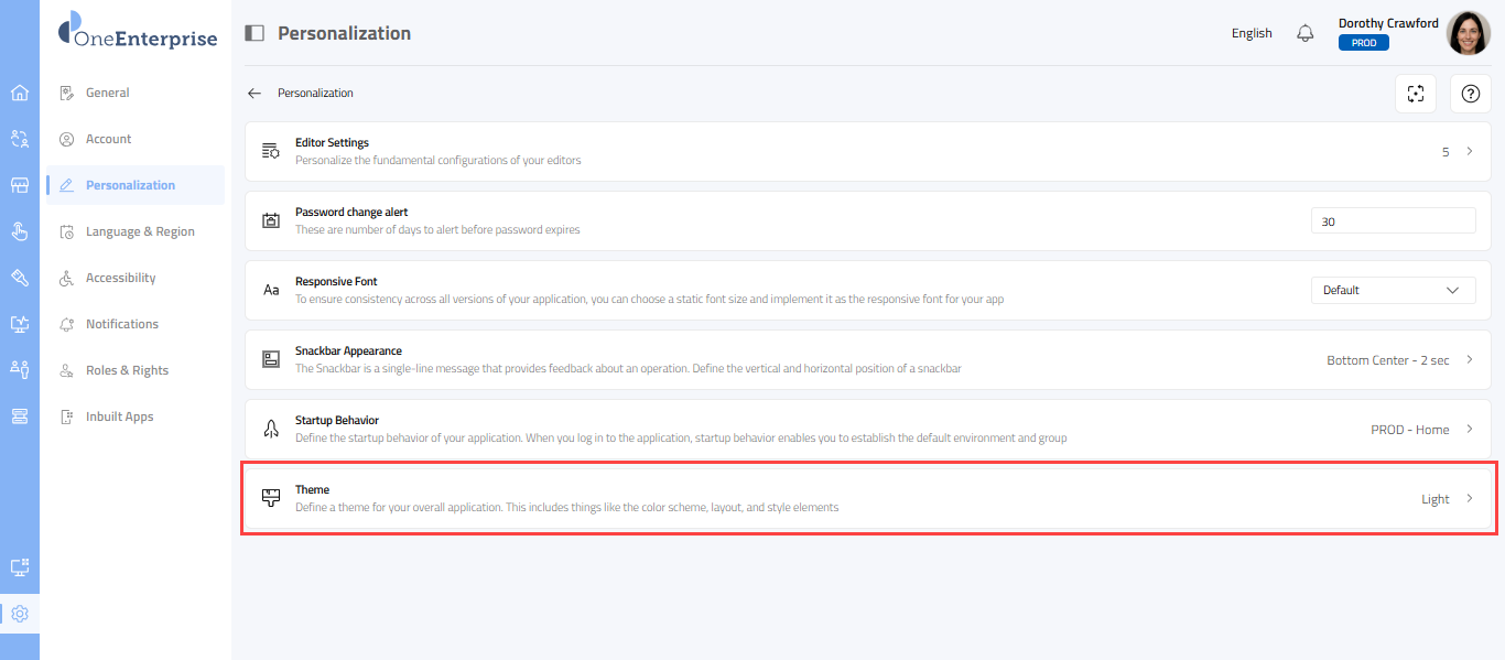 - Click on the Theme. The current theme, which is in use, is displayed before the chevron icon.