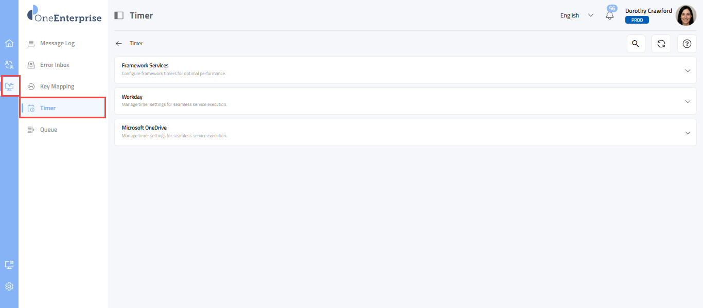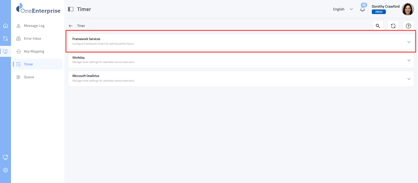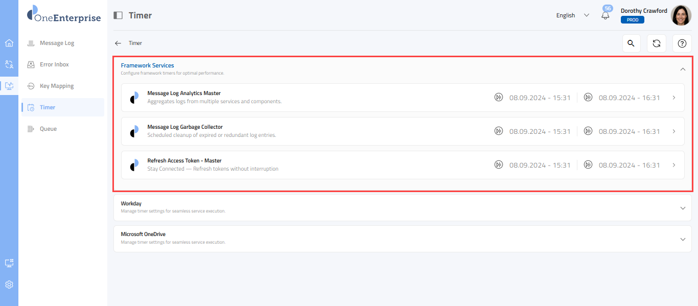 This article outlines a detailed framework and timer-based services. Framework services are essential, foundational components within the OneEnterprise platform that support and oversee the execution, communication, and lifecycle of all other services. They provide the infrastructure and runtime environment that allow other modules, such as timer-based services, APIs, or integration flows, to operate efficiently and reliably.
