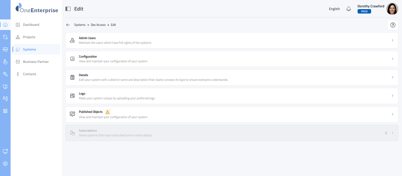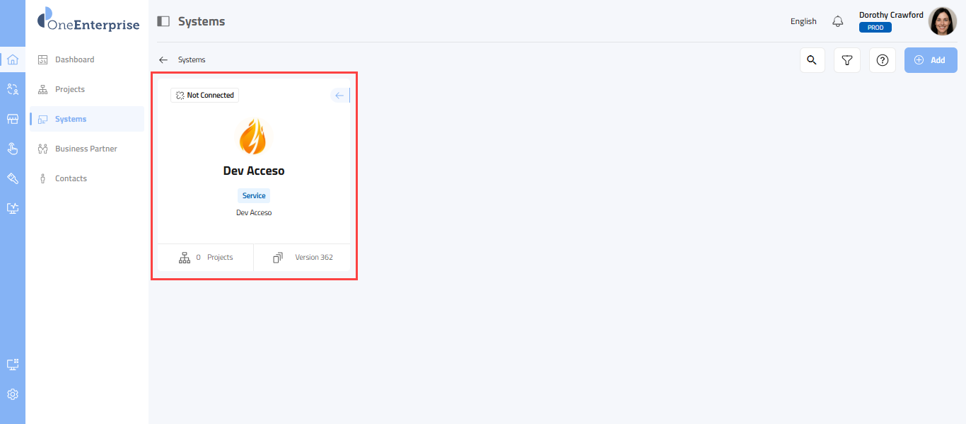 The widget displays the project details that are associated with the chosen system. A list of projects will be shown with name, logo, and description. If you want to see more details about the project, click on the respective band. Clicking on it will take you to the Project module with its detail screen open.