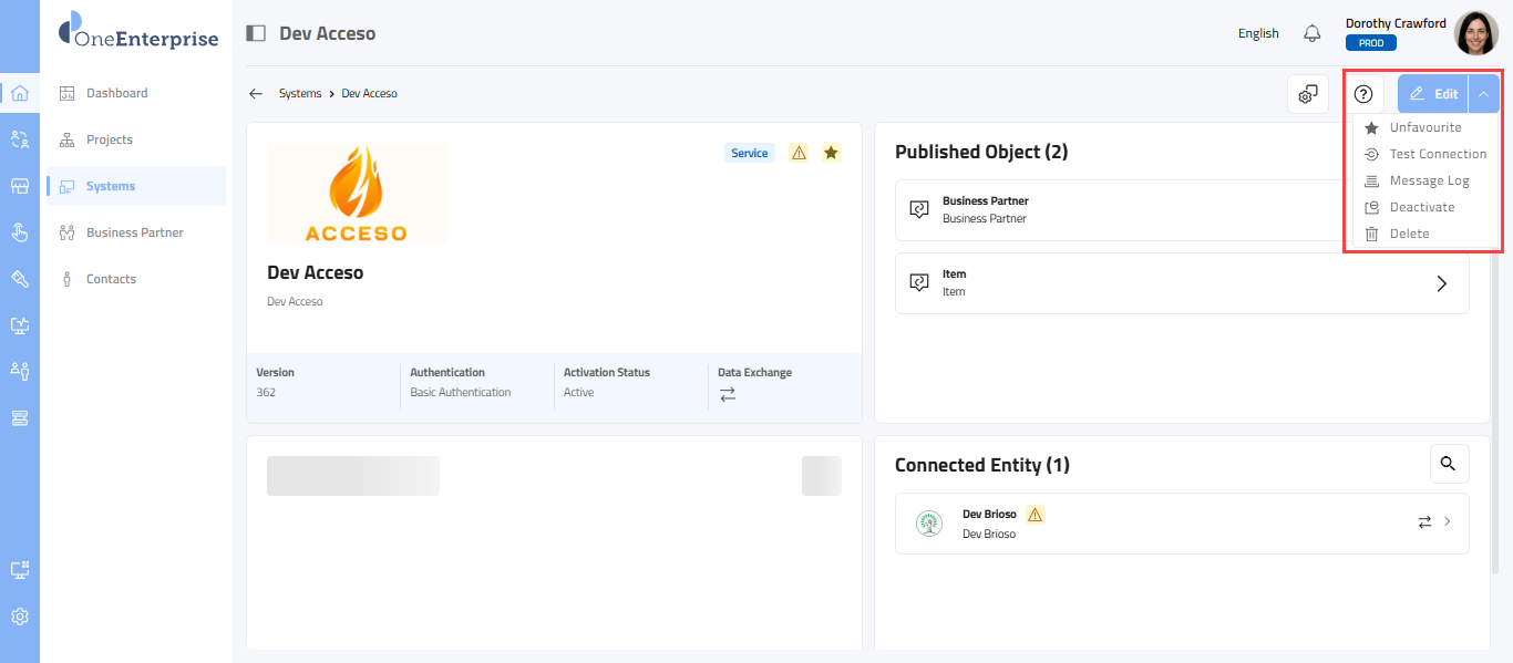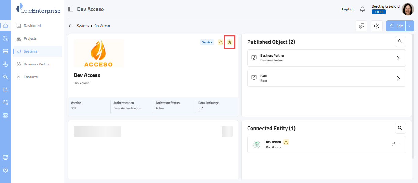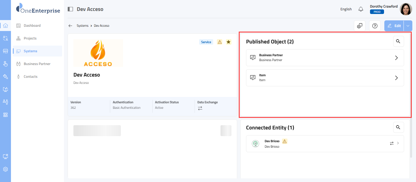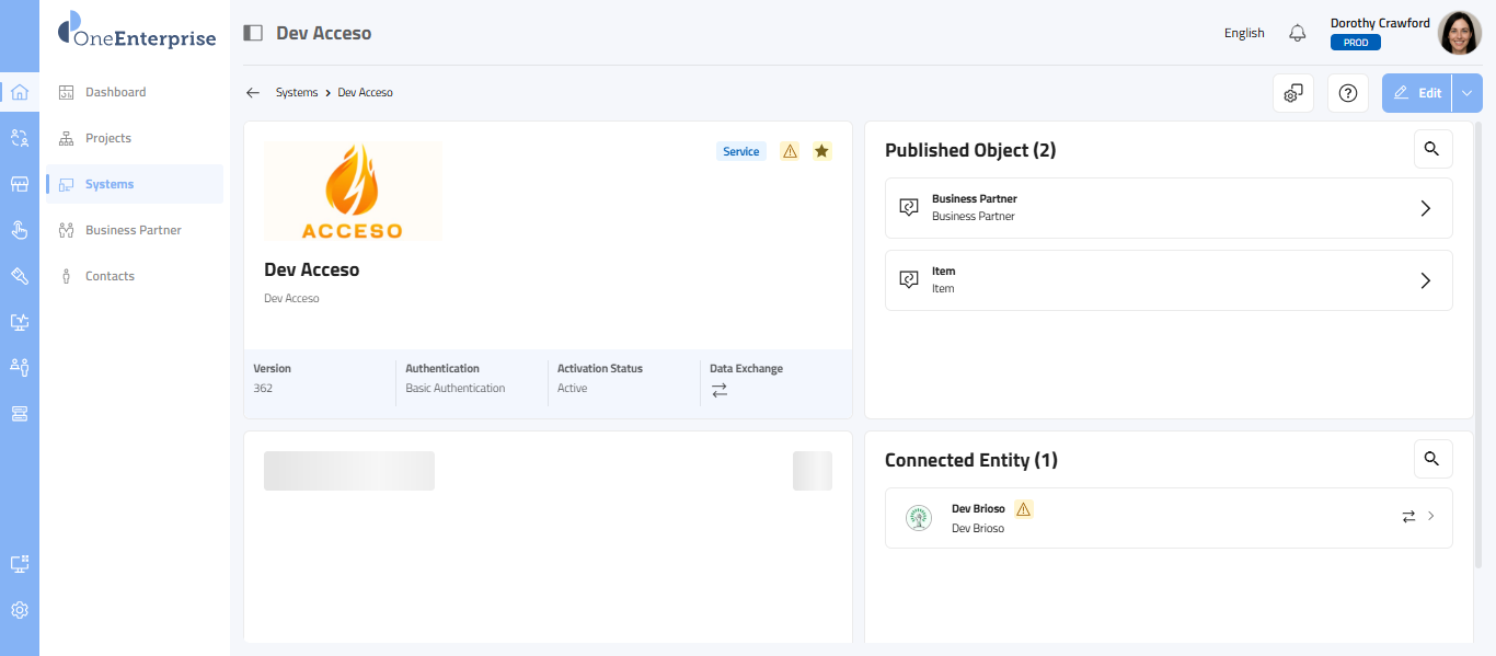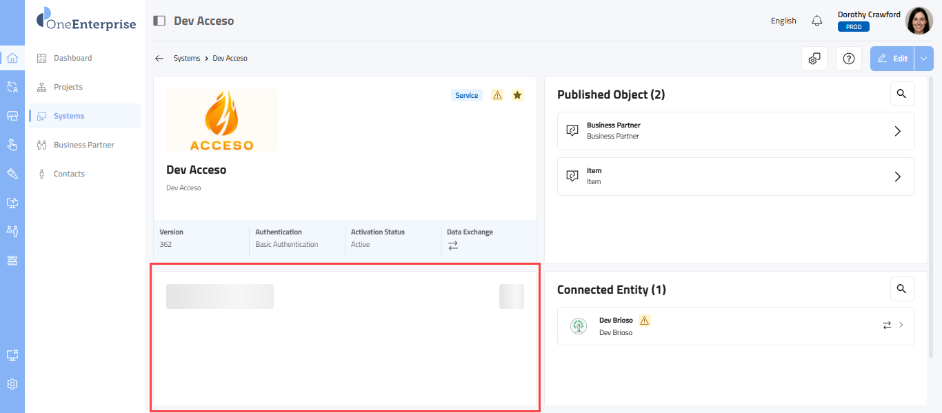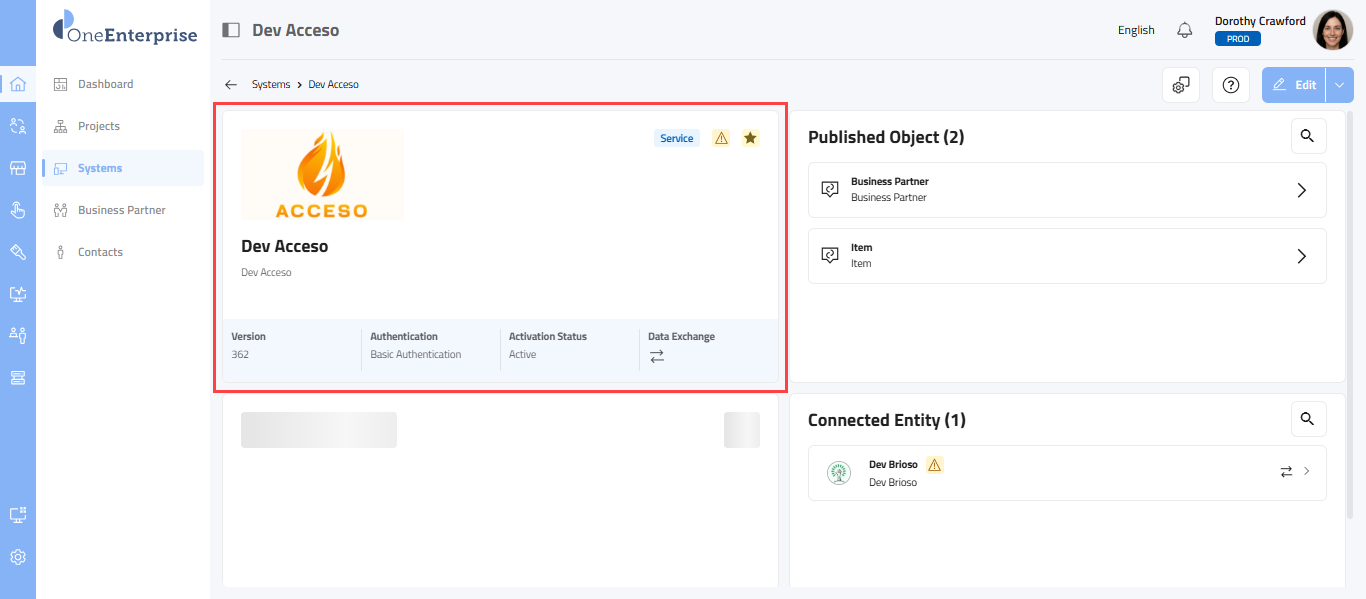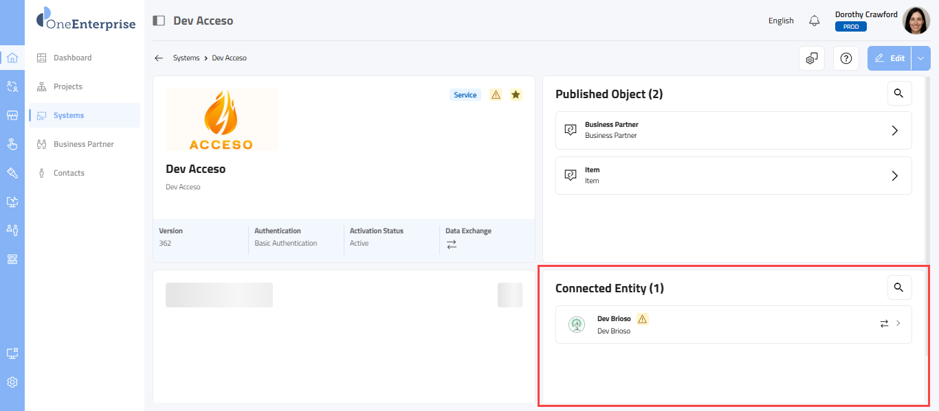 The widget displays a list of entities connected to the selected system. The list will include each entity's name, logo, and description. Each entity is shown on a separate band. If you want to see more details about a connected entity, click on its respective band. Clicking on an entity will take you to the System Overview screen of that system.