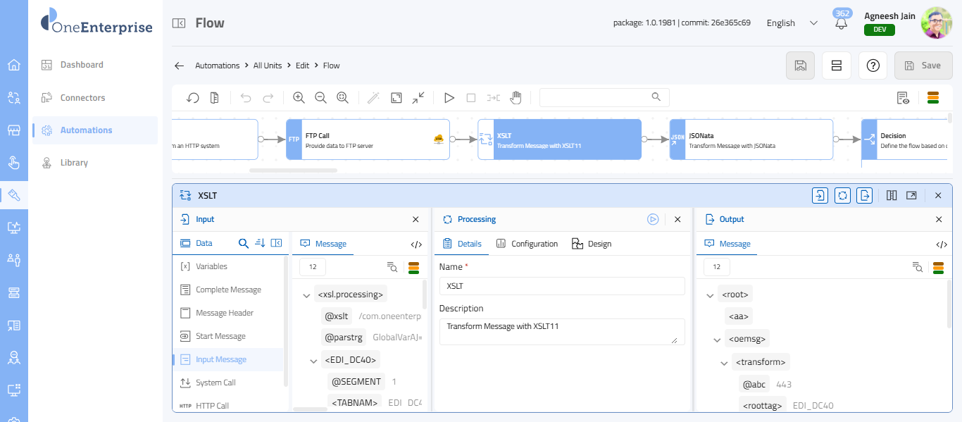Overview The XSLT Unit is an action unit in the Flow Editor/Designer that enables you to transform XML data using XSLT (Extensible Stylesheet Language Transformations) during execution. It allows complex XML transformations, mappings, and ...